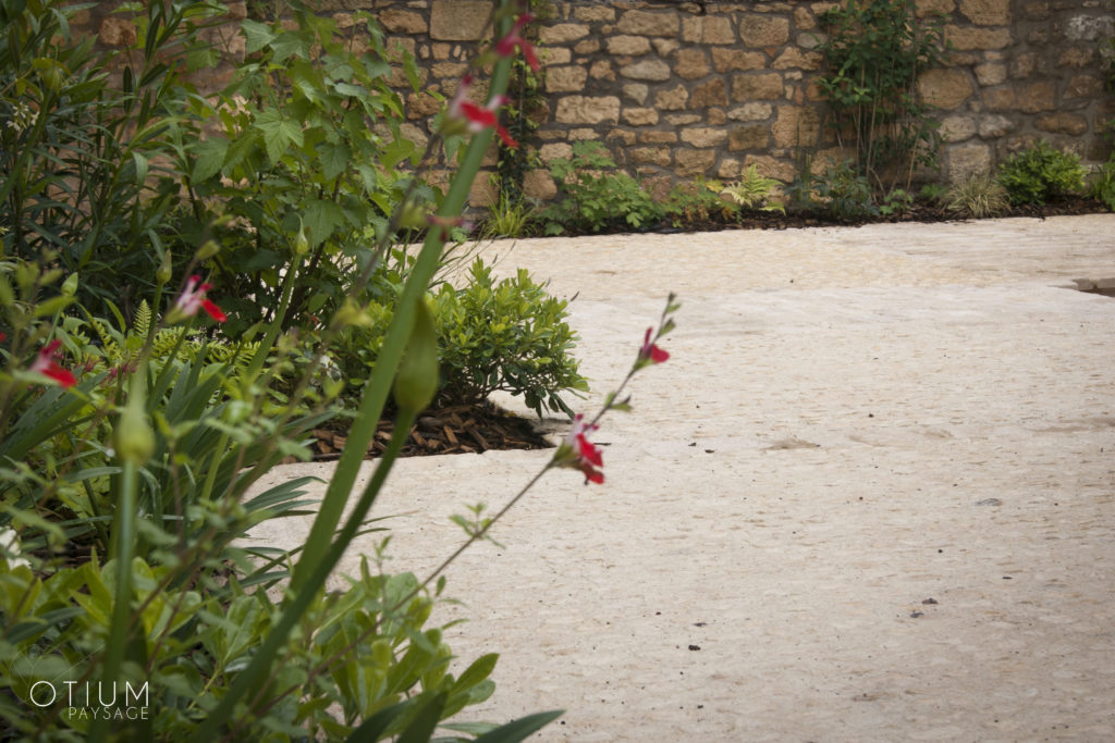 Aménagement d’une cour à Domme : Jardin, Fontaine, pierre Locale et massifs généreux